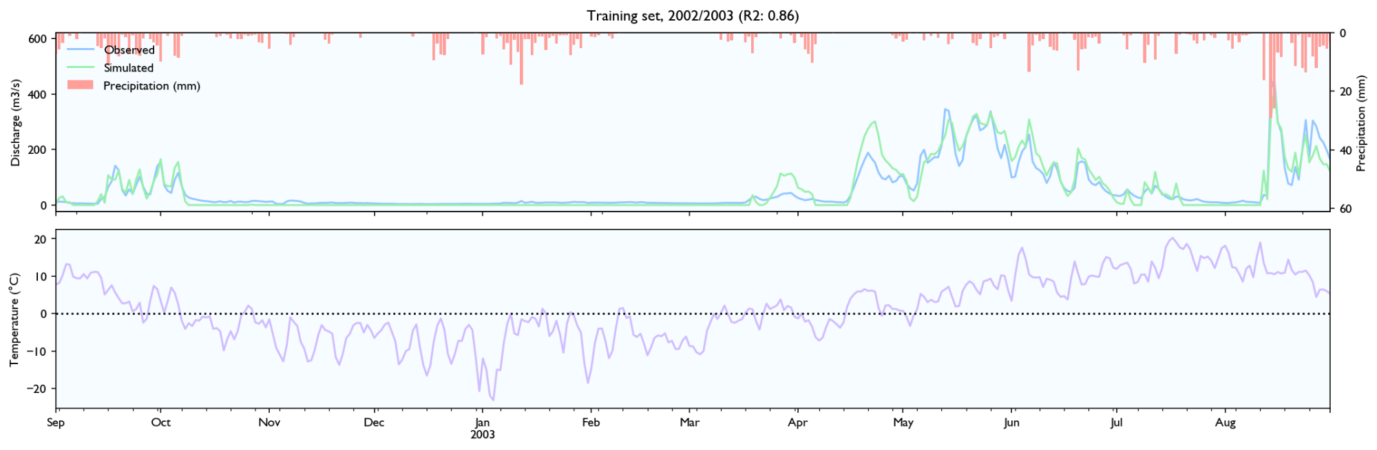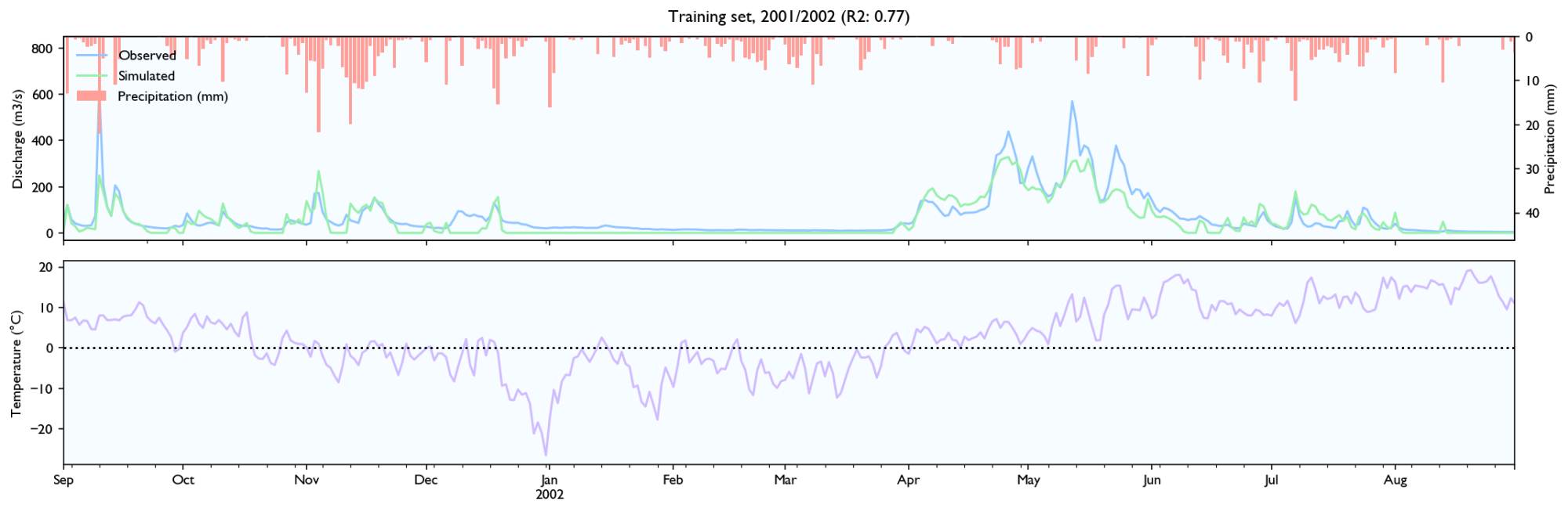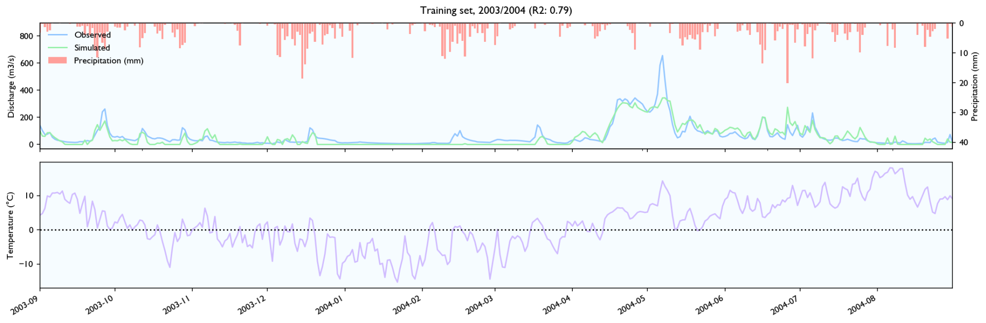 I used a short 15-years dataset from Hagabru, a discharge station in the Gaula river system, south of Trondheim (Norway). This catchment has a big area of 3059,5 km2 and no lakes to dampen responses. The first 12-years are used as training set, the last 3 years as validation set.